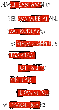 Bu siteyi, bir web sayfası hazırlarken, ihtiyaç duyacağınız her türlü bilgi ve malzemeyi sağlamak amacıyla hazırladım. Burada sayfa hazırlama konusunda bilgisi olmayanlardan, artık bu konuda tecrübe sahibi olmuş herkesin işine yarayacak pratik bilgiler bulabilirsiniz. "Nasıl Başlamalı?", sayfa hazırlamaya yeni başlayacakların merak ettikleri bir çok soruya cevap vermektedir. Burayı, bir sayfa hazırlamanın aslında ne kadar kolay bir iş olduğu hakkında fikir edinmeniz ve yeni başlayacaklara da moral vermek amacıyla hazırladım. "Bedava Web Alanı"'ında, ücretsiz sayfa veren sitelerin ayrıntılı bilgileri ile linklerini bulabilirsiniz. "HTML Kodlama", HTML ile sayfa hazırlayabilmeniz için bilmeniz gereken herşeyi sıfırdan ve adım adım anlatmaktadır. Yeni başlayacaklar için bu kodları nerede, nasıl yazacaklarını ve web alanlarına nasıl aktaracaklarını da resimlerle anlatmaktadır. HTML kodlamayı, güzel ve akılcı hazırlanmış anlatımlarla kısa sürede kavrayabilirsiniz. Burası sık sık uğrayacağınız kaynağınız olacak. "Scripts & Applets"'de, internetten derlediğim birçok Java script ve applet yer almakta. Burada kendi sayfalarınıza uygun hoş malzemeler bulabilirsiniz. "Kısa Kısa" bölümünde ise sıkça sorulan sorulara cevaplar bulacaksınız. Ayrıca burada bulunan, sayfa ve grafik tasarımı üzerine pratik bilgiler ile sayfalarınızı daha çekici bir hale getirebilirsiniz . "Gif & Jpg" bölümünde internette jpg, gif, arkaplan ve hareketli gifler bulabileceğiniz bir çok link bulabilirsiniz. Web sayfalarınızda bu resimleri kullanarak güzel bir görünüm elde edebilirsiniz. "Fontlar"'da ise yine sayfanızda kullanabileceğiniz ilginç fontların bulunduğu internet sayfalarına linkler bulacaksınız. "Download" bölümümüzde, tasarımınız için gerekli bir çok grafik ve html editor programlarını bulabilirsiniz. Tabii ki 30 günlük kullanım süreli. Ama yine de işinize yarayacaktır. Ayrıca programlarla ilgili ayrıntılı bilgileri de burada bulabilirsiniz. "Message Board"' a sorularınızı bırakarak cevap gelmesini bekleyebilirsin. Bu board ile birbirinizin sorularını cevaplayarak hem kendinize yardım almış olursunuz, hemde diğer soru ve cevaplardan yararlanmış olursunuz. Eğer sayfa ile ilgili görüş ve tavsiyelerinizi iletmek yada herhangi bir konuda soru sormak isterseniz e-mail ile bana ulaşabilirsiniz. |